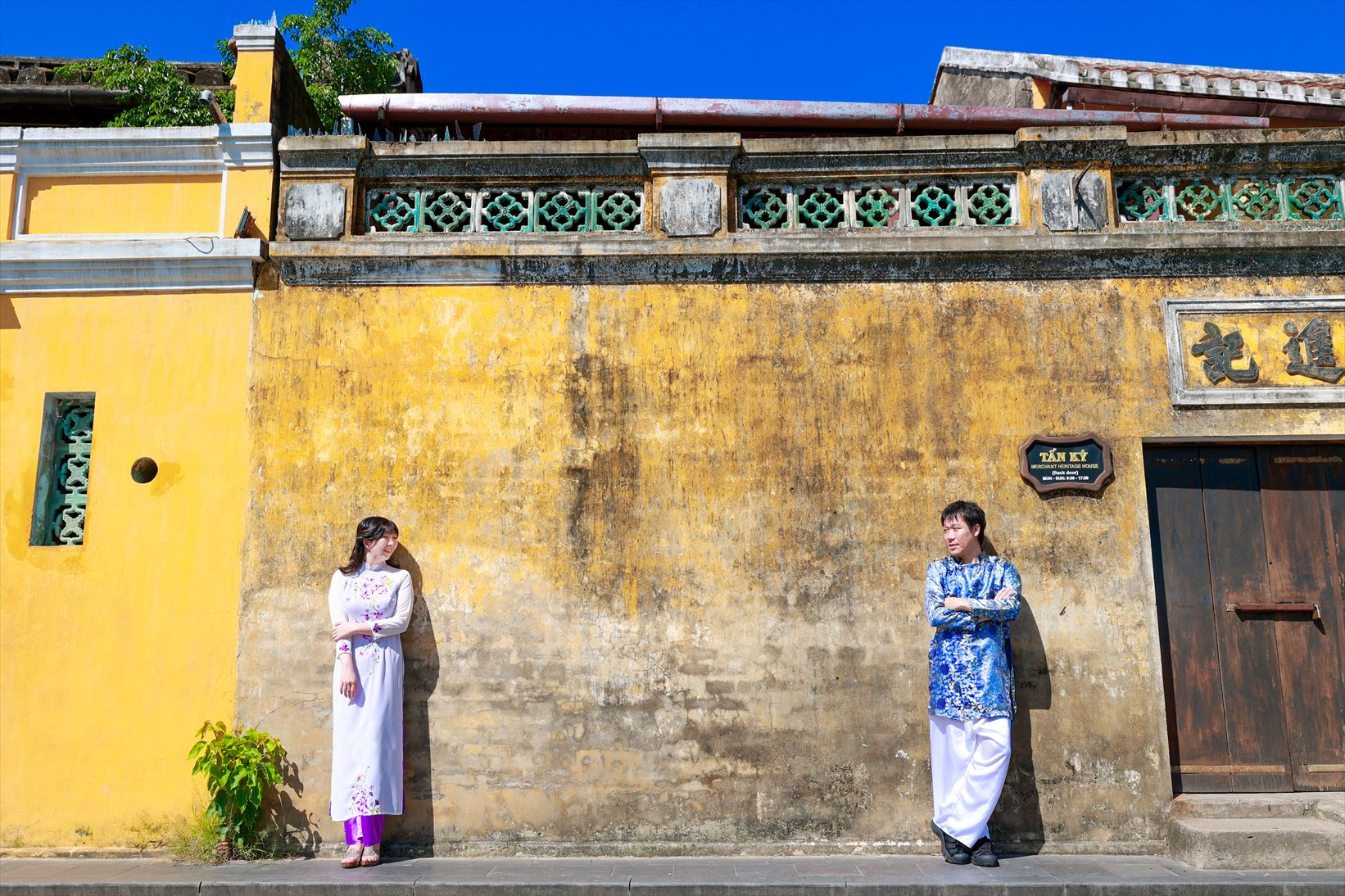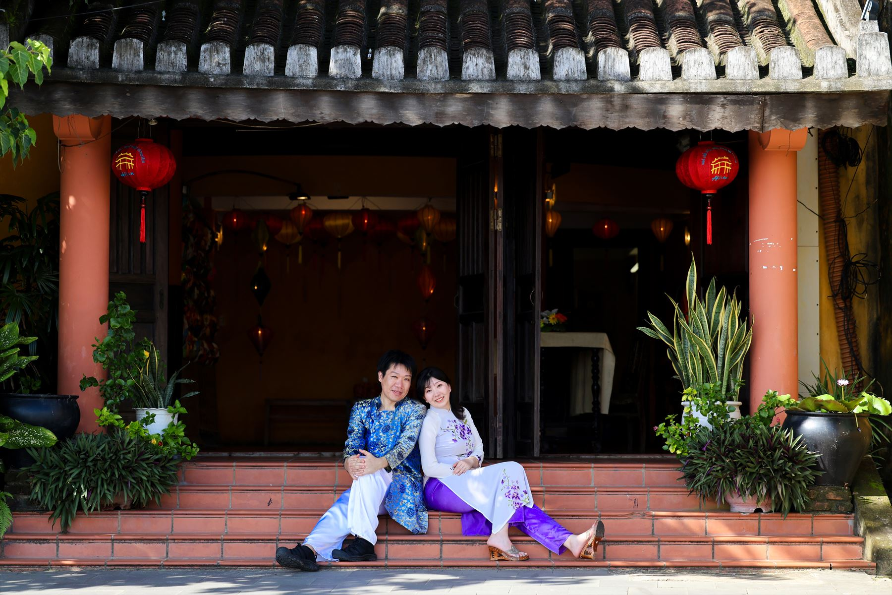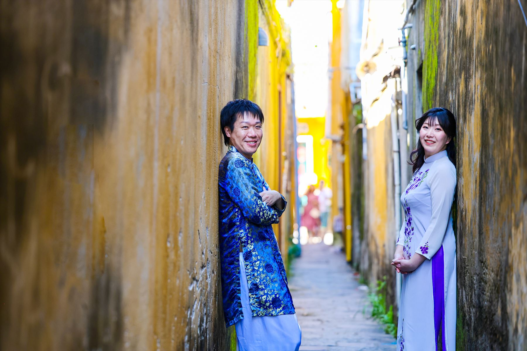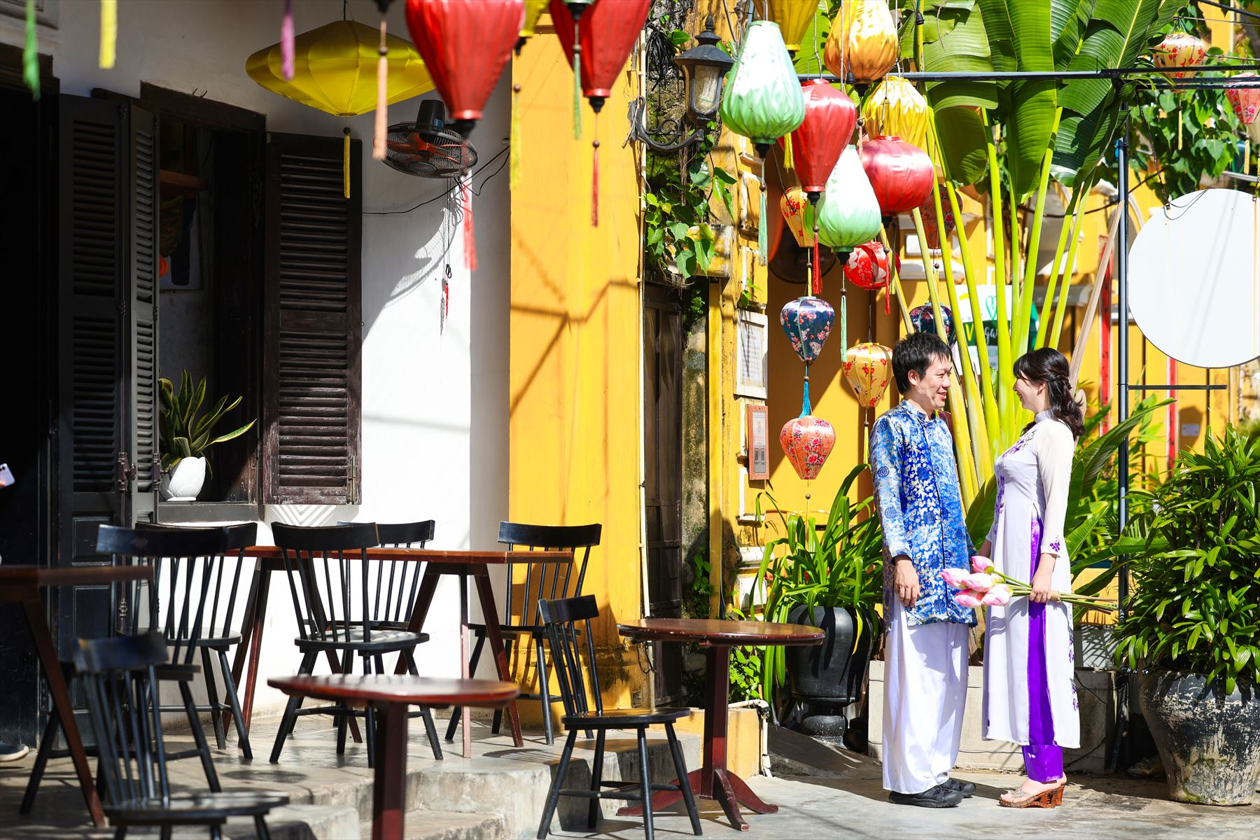 ホイアンは、古い街並みや建造物が残る歴史的な街として知られています。多くの建物が17世紀から19世紀にかけての中国や日本、フランスの影響を受けたものであり、その雰囲気は非常に魅力的です。お二人のアオザイ姿がホイアンの街並みとよく合っていますね。