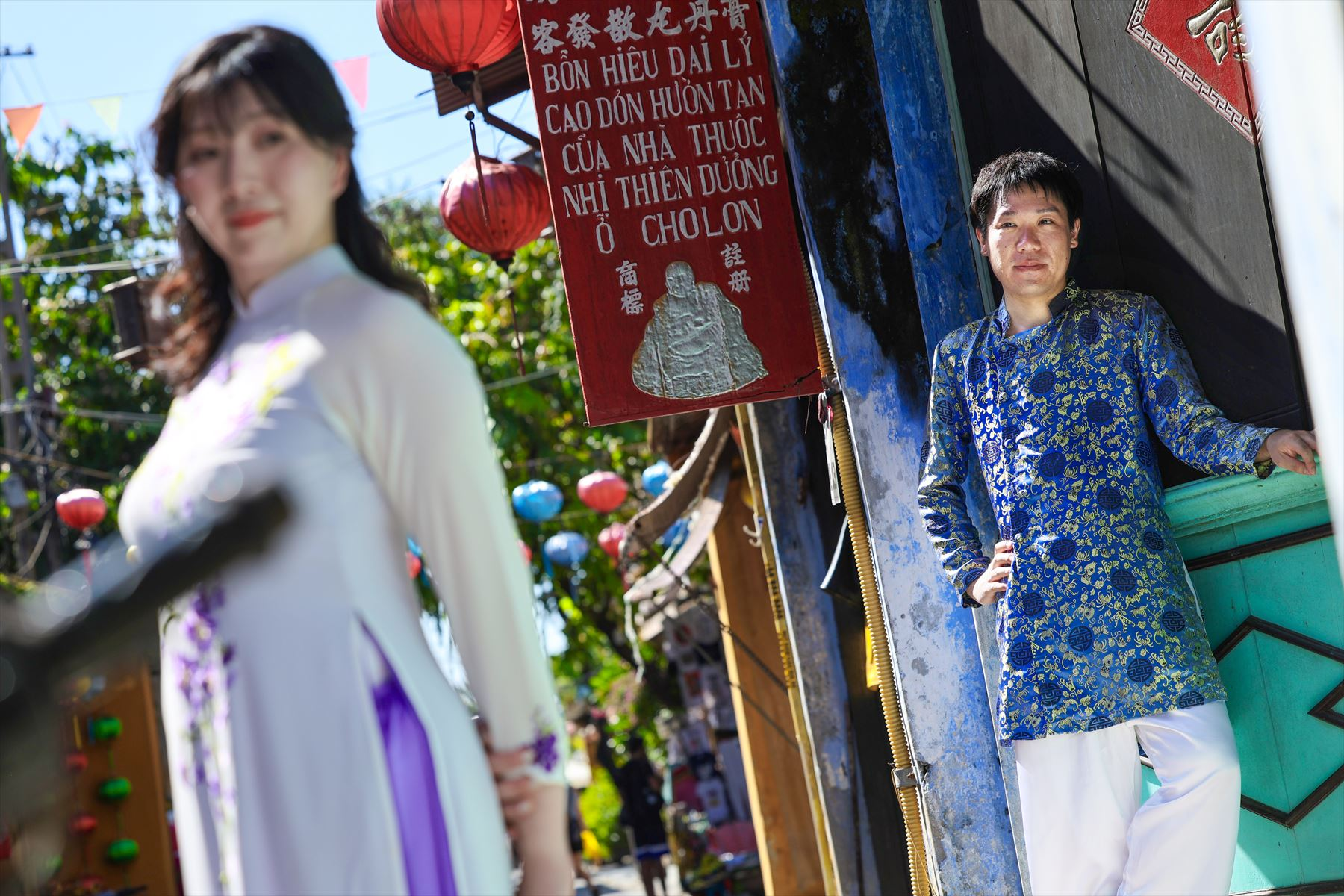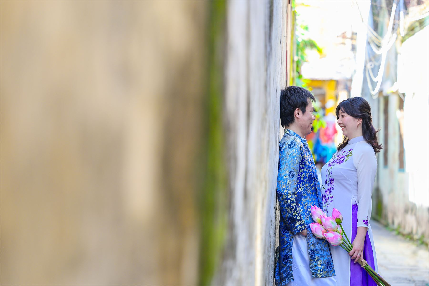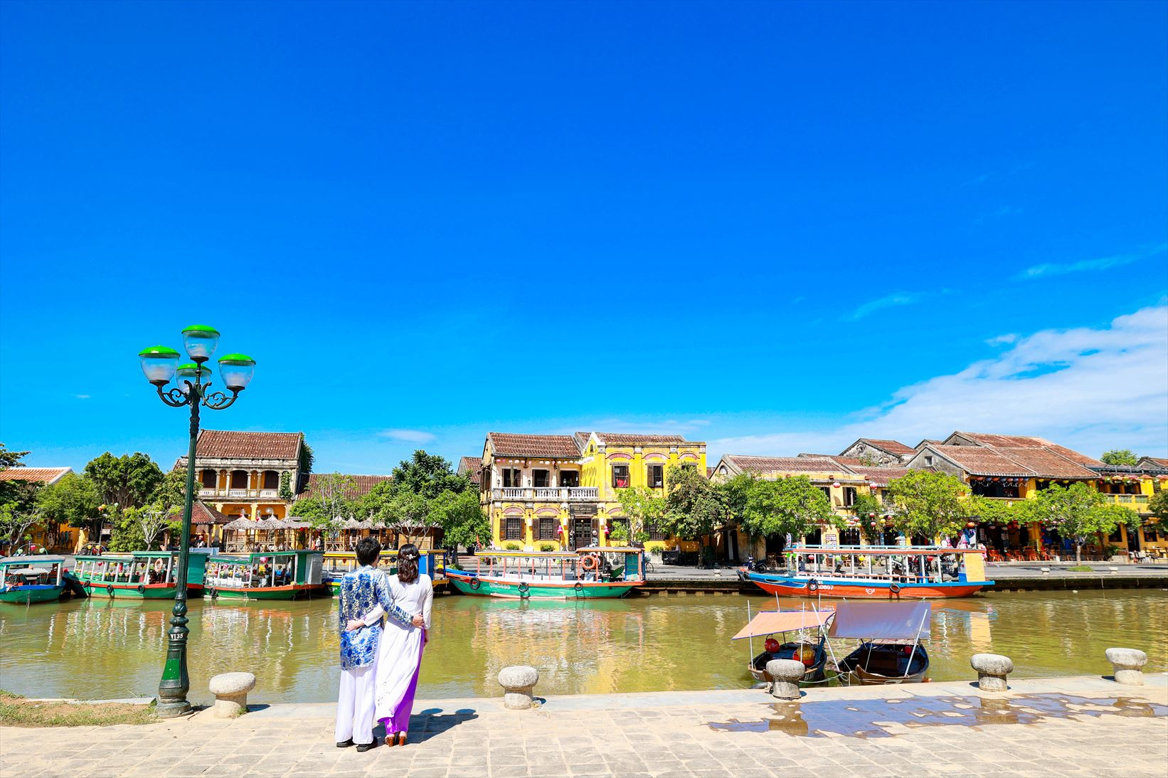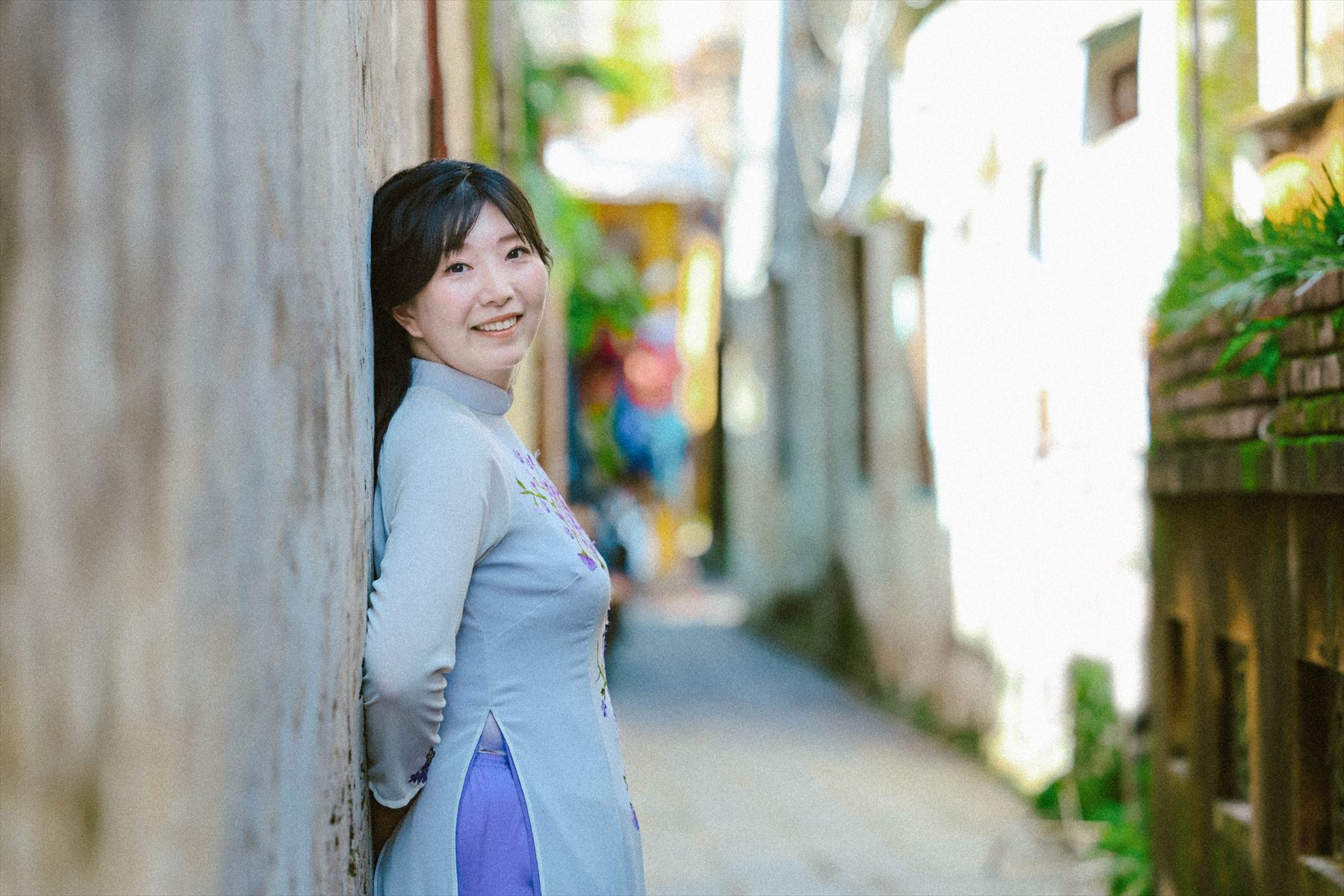 ホイアンは、古い街並みや建造物が残る歴史的な街として知られています。多くの建物が17世紀から19世紀にかけての中国や日本、フランスの影響を受けたものであり、その雰囲気は非常に魅力的です。お二人のアオザイ姿がホイアンの街並みとよく合っていますね。