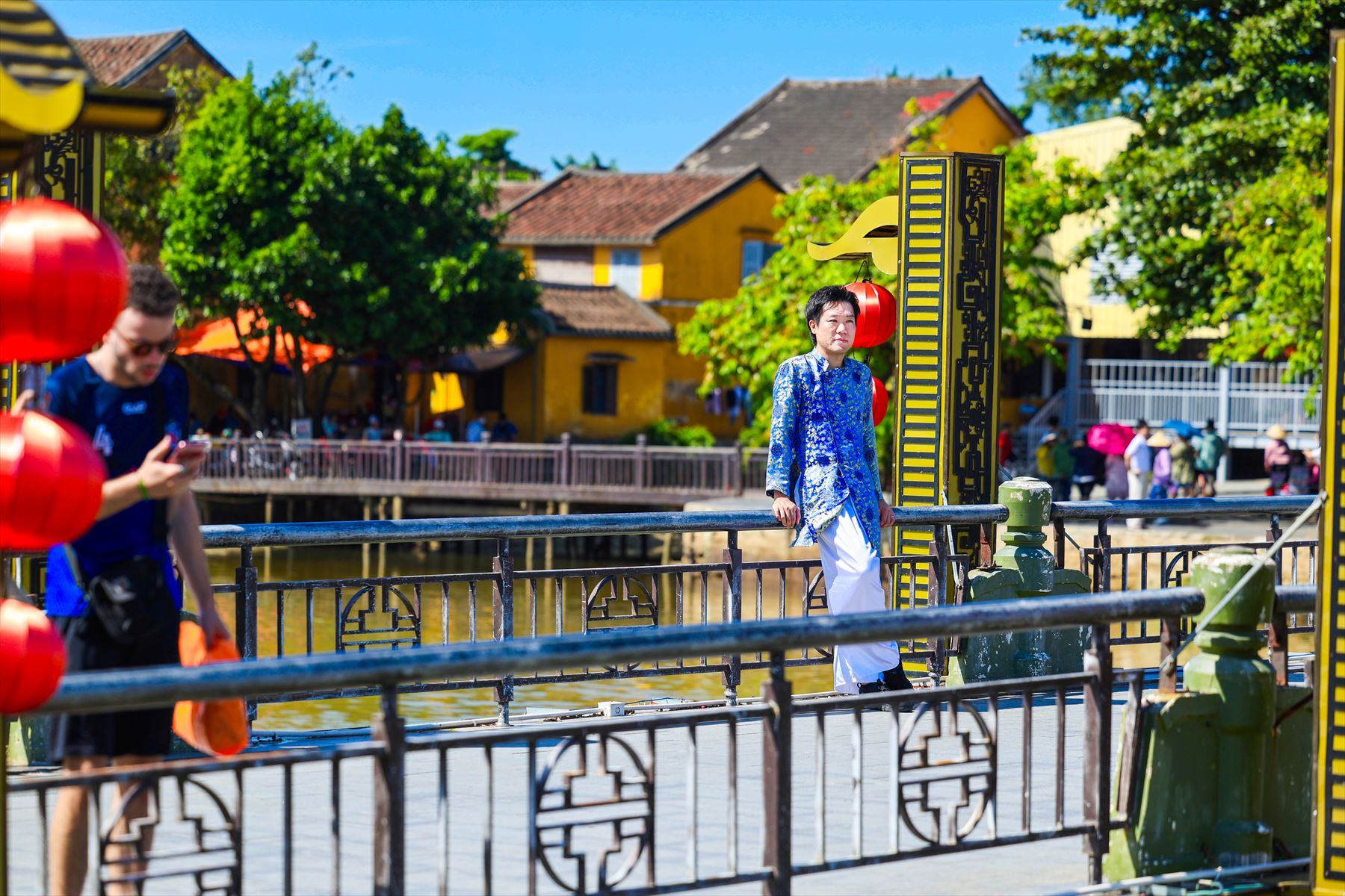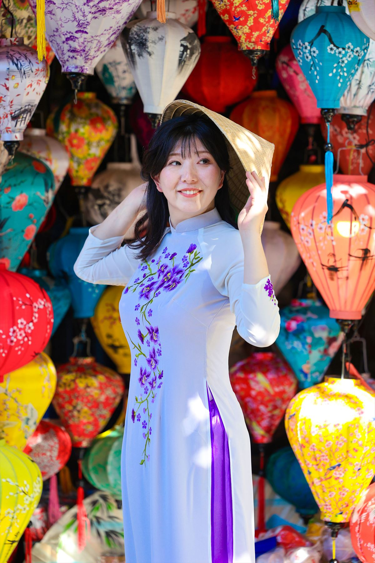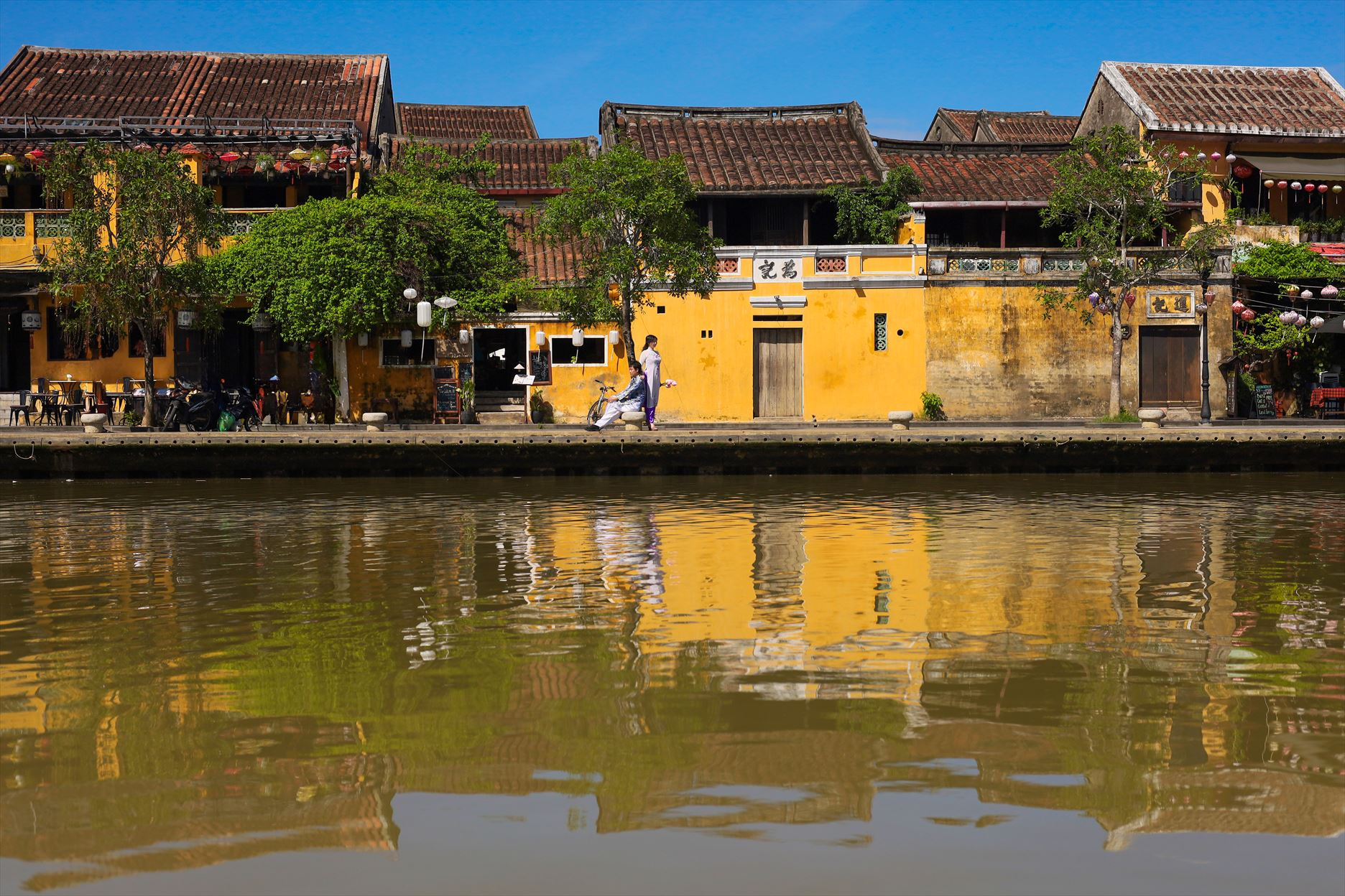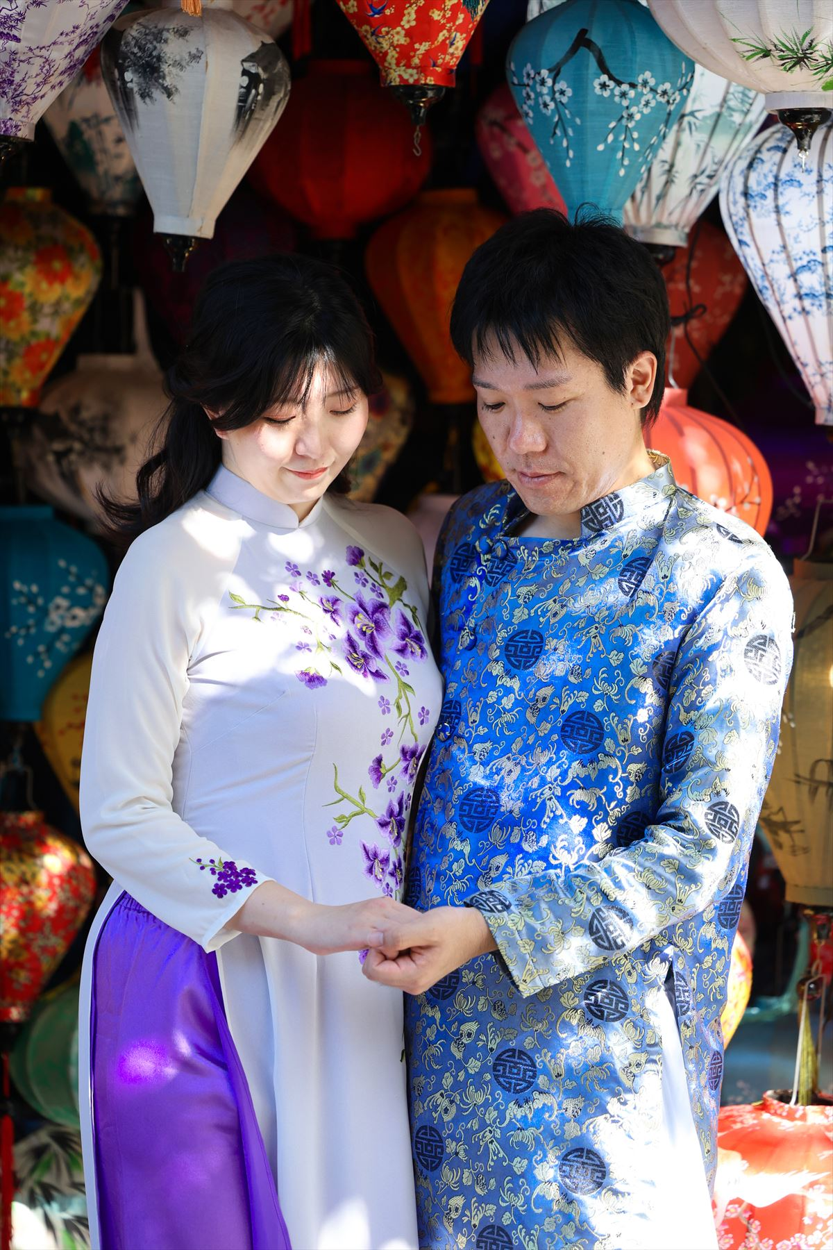 ホイアンは、古い街並みや建造物が残る歴史的な街として知られています。多くの建物が17世紀から19世紀にかけての中国や日本、フランスの影響を受けたものであり、その雰囲気は非常に魅力的です。お二人のアオザイ姿がホイアンの街並みとよく合っていますね。