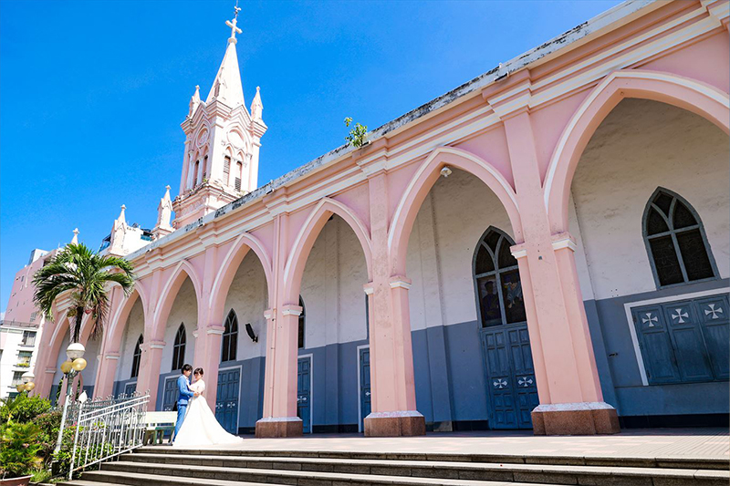 パステルピンクの外観が特徴のダナン大聖堂。約100年前のフランス統治時代に建てられた教会で観光名所としても有名です。ウェディングドレス・タキシードでもアオザイでも絵になるロマンティックな雰囲気のスポットです。