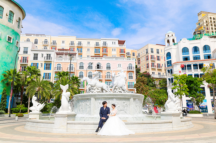 フーコック島北部に2021年4月にオープンしたグランドワールドは、「眠らない街」をコンセプトにした巨大複合施設です。イタリアのベニスを彷彿とさせる運河やカラフルな建物、華やかな広場が広がり、まるでヨーロッパにいるかのような多様な背景で撮影が楽しめます。ベトナムにいながらにして異国情緒あふれるロケーションでの撮影が可能で、テーマパークのような雰囲気の中で、ユニークで楽しいウェディングフォトを残したいカップルにおすすめです。
