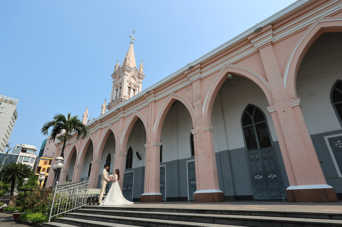パステルピンクの可愛らしい外観が目を引くダナン大聖堂は、約100年前のフランス統治時代に建てられた歴史ある教会です。そのロマンティックで可愛らしい雰囲気は、ウェディングドレスはもちろん、ベトナムらしいアオザイ姿でも絵になる特別なウェディングフォトを演出します。