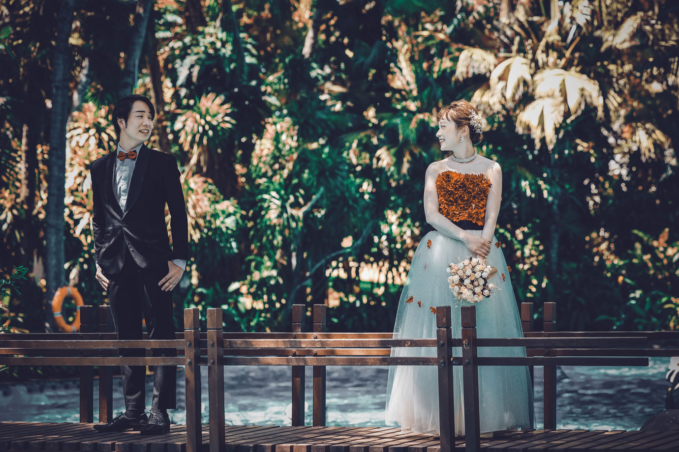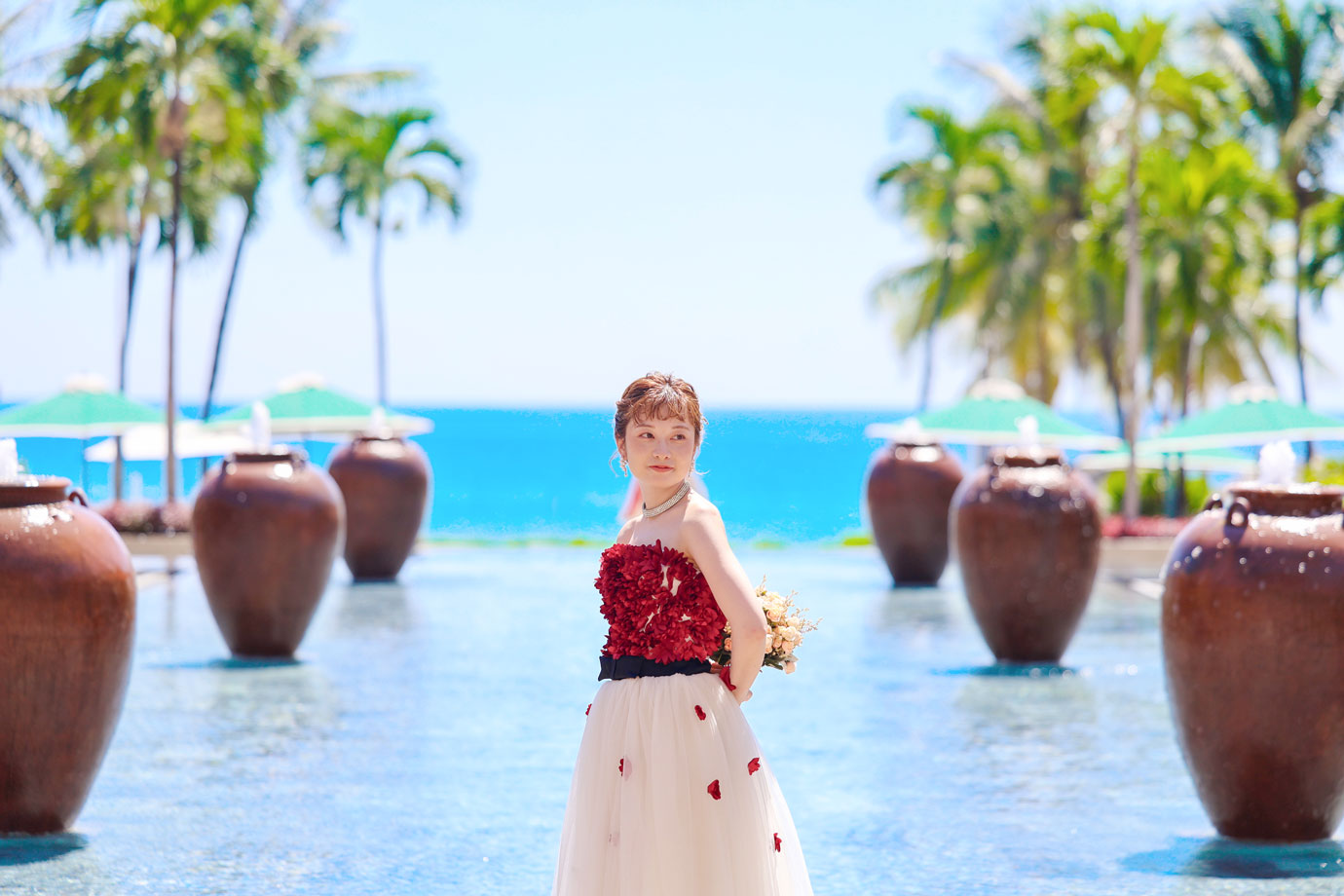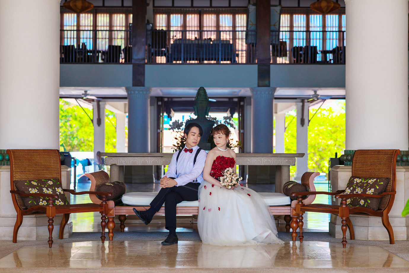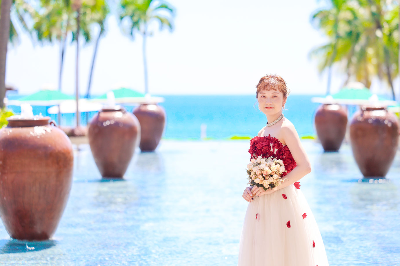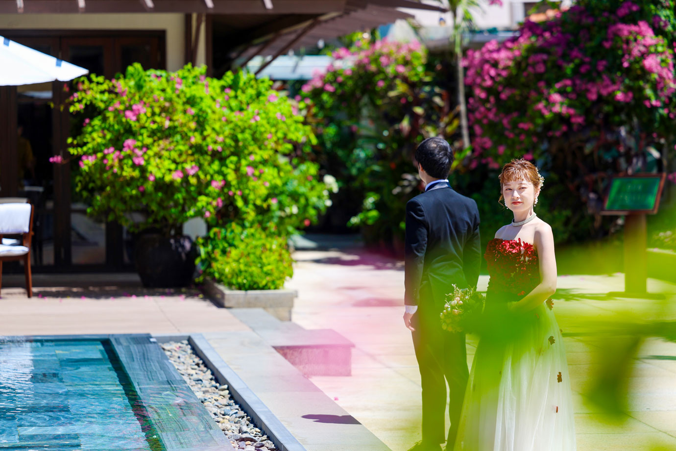 フラマリゾートの静寂で美しいロケーションがお二人の凛とした美しさを引き立てていました。心からリラックスされた柔らかな表情が、お写真からも溢れ出しています。