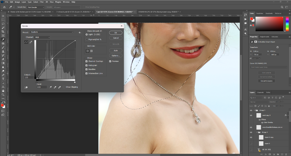 表情や影、ポーズによって、お顔や首のシワが深くみえる場合は、シワを消したり影を薄くします。